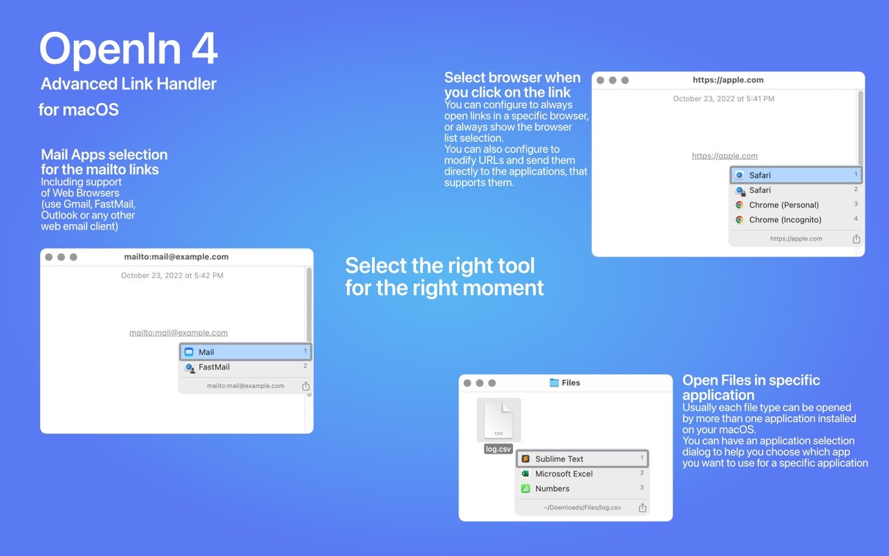 OpenIn.app is an advanced utility that allows you open links, emails, and files in the application of your choice. Just click it, and select the application from the list. This is the easiest way to organize your workflow.