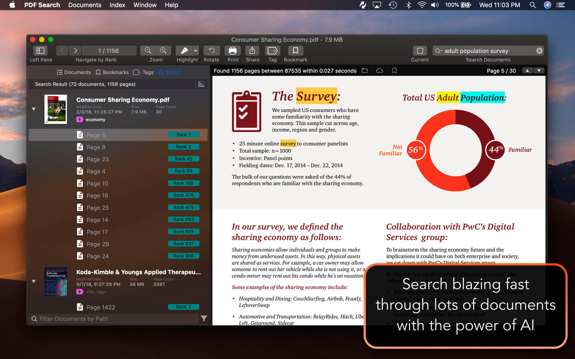 PDF Search is a utility which has a revolutionary search algorithm especially developed for PDF documents. The time to reach the information in your PDF documents will be minimum with it. It will make you able to find what you are looking for within thousands of documents instantly. It is system integrated. You can start a search directly from system menu bar like Spotlight.