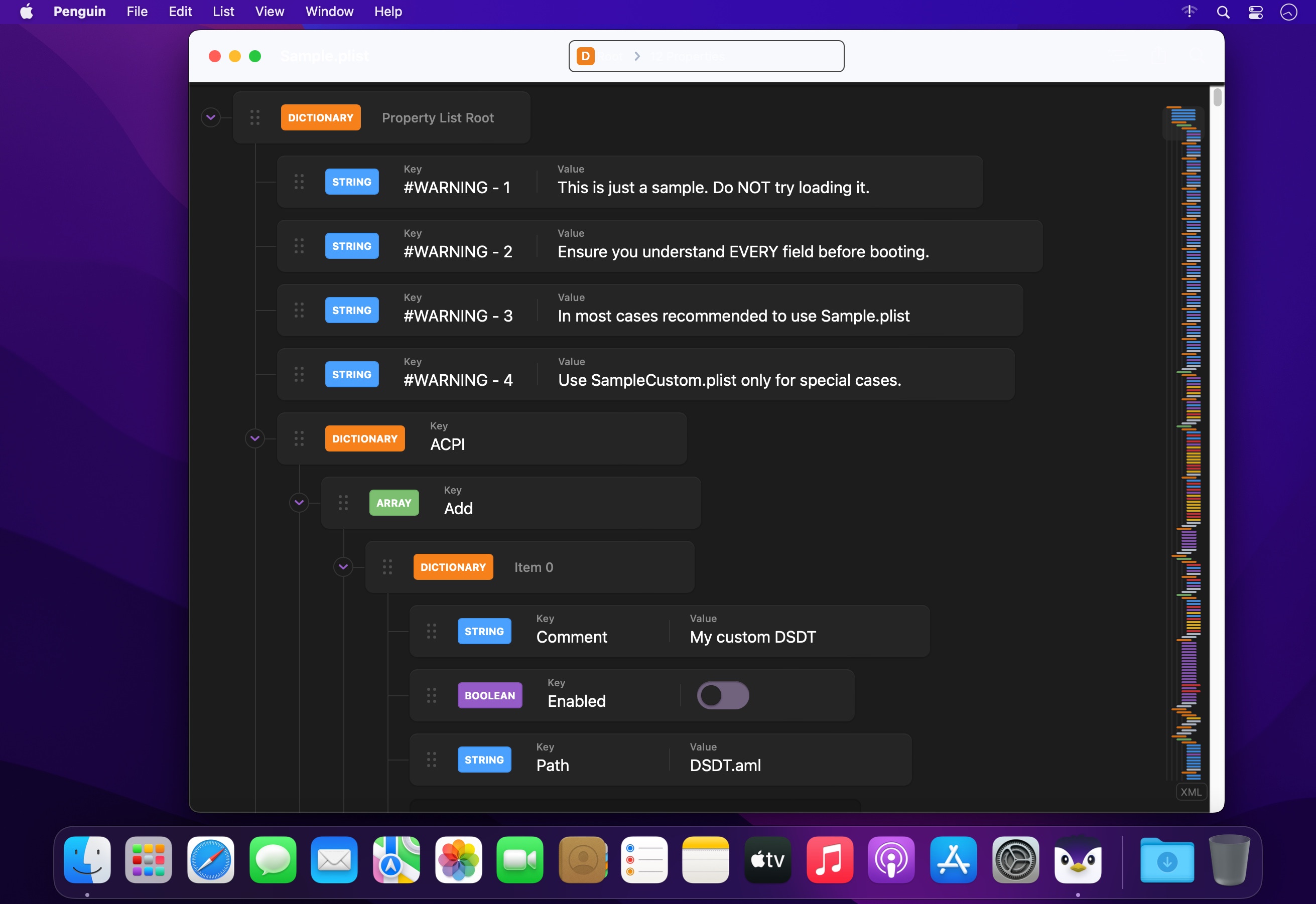 Penguin is loaded with tools and features that make editing plists a breeze. Keyboard shortcuts help you traverse the document tree, add new nodes and expand or collapse list segments. Contextual right-click menus allow you to export segments of the plist as XML, JSON, Swift or Obj-C code. A built in linter ensures your files are error-free.