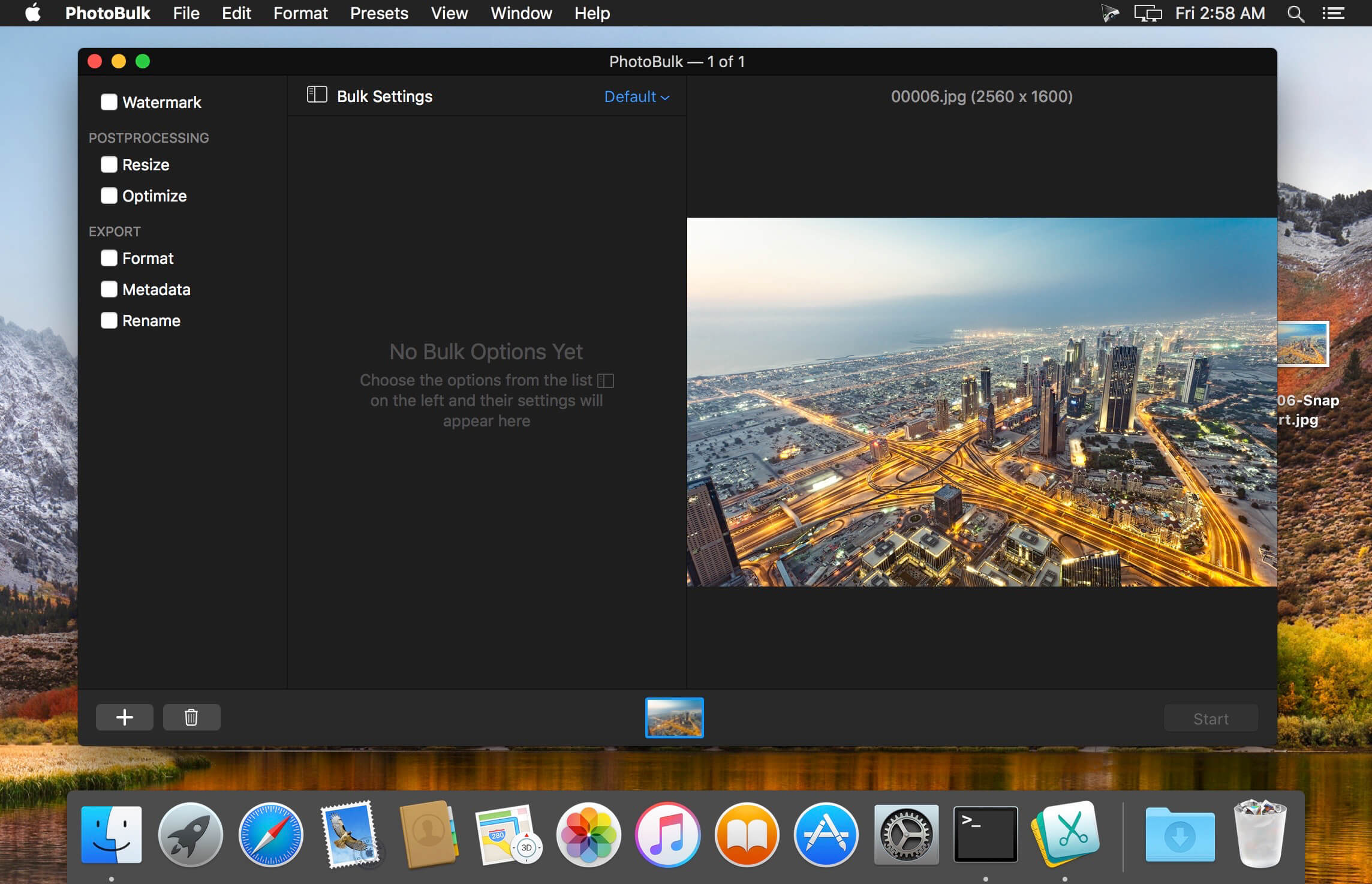 Save time on image processing with PhotoBulk, a simple app for batch/bulk resizing, optimization, and watermarking photos and images.