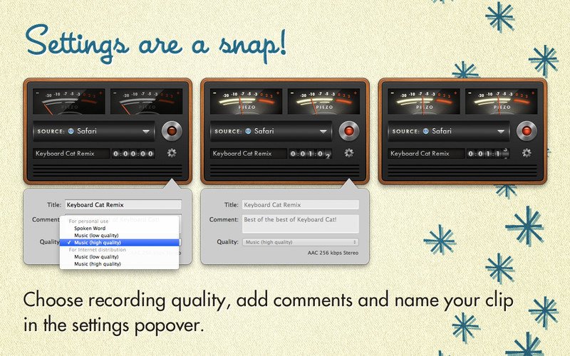 Piezo makes it a snap to record audio on your Mac. In seconds, you’ll be recording audio from any application or from audio inputs like microphones. Piezo requires almost no configuration, and it’s a blast to use! Simple and inexpensive – that’s a winning combination.