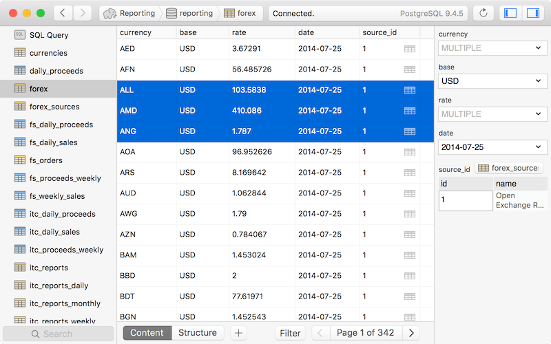 Postico provides an easy to use interface, making Postgres more accessible for newcomers and specialists alike. Postico will look familiar to anyone who has used a Mac before. Just connect to a database and begin working with tables and views. Start with the basics and learn about advanced features of PostgreSQL as you go along. Postico is an intuitive app for looking at data. Filter rows, sort them, rearrange columns. You can examine long text or images conveniently in the sidebar. Even related rows from referenced tables are shown. Edit rows directly, or use the sidebar, a great choice for long text. You can even change multiple rows at once. Batch saving (with SQL preview) lets you commit changes to multiple rows in a single transaction. Postico sports a query view inspired by Sequel Pro, the popular MySQL client. But with sophisticated features like multiple query results, Postico goes even beyond its role model.