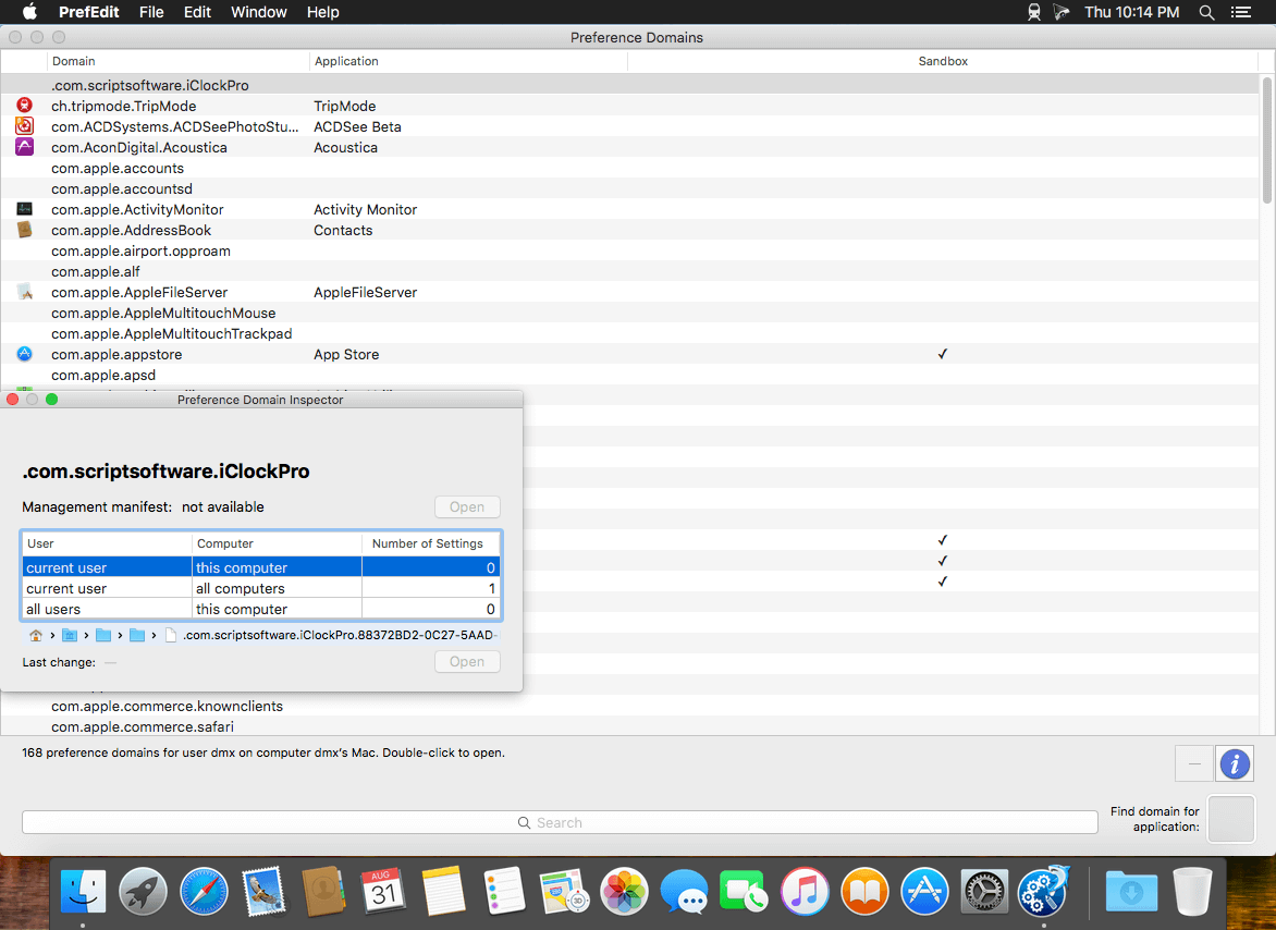 PrefEdit is a utility that allows you to inspect and edit all preference settings for OS X applications. The settings are displayed in a browser and can be edited by simple point-and-click operations. You can also do a full-text search on all settings, or clean up unused entries of applications that have been uninstalled.