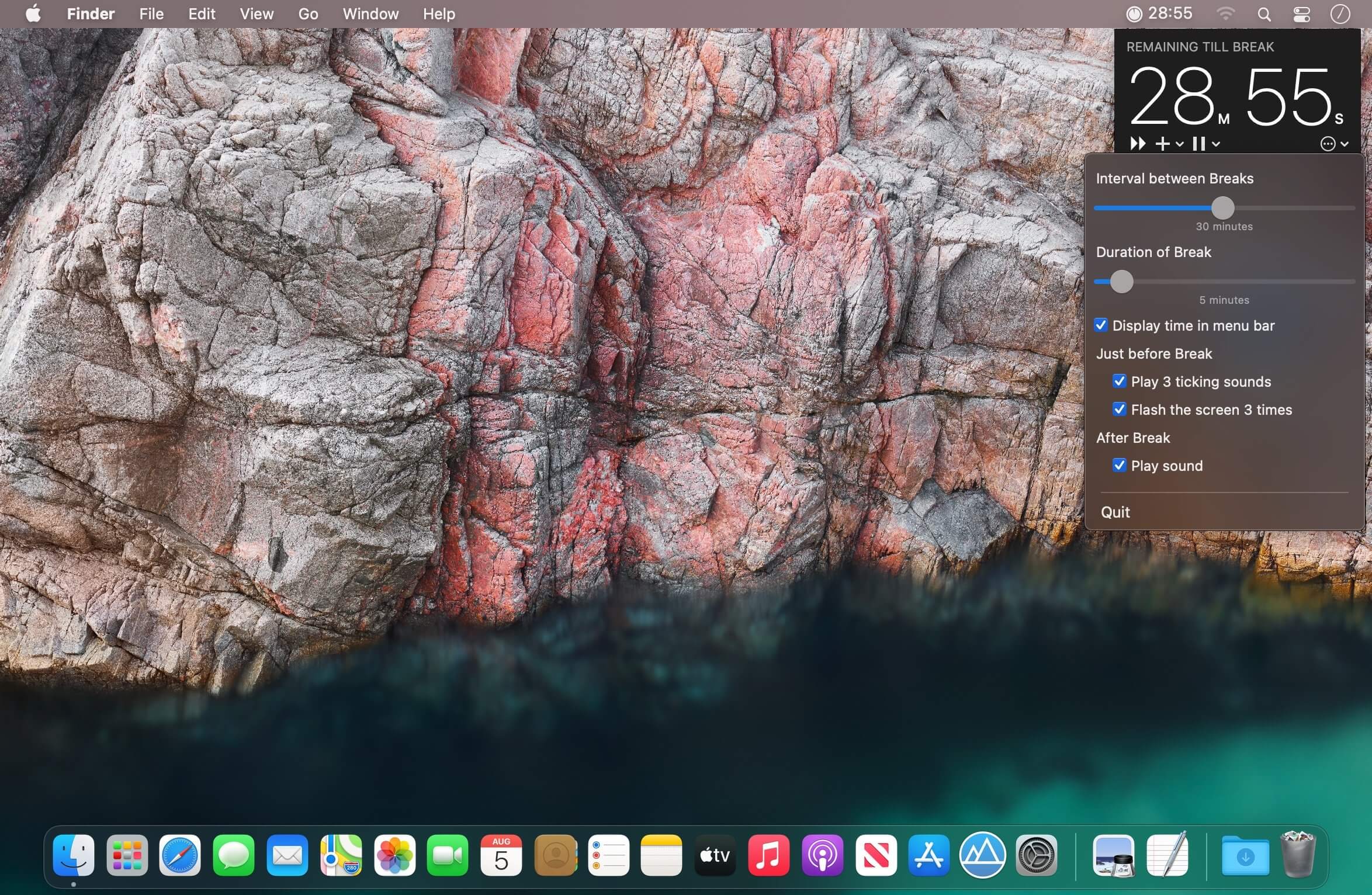 - 3-, 5- and 10-minute warnings before breaks