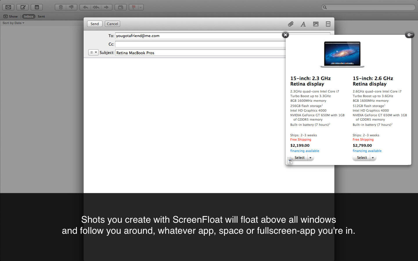 ScreenFloat allows you to create screenshots which float above all other windows so that information is always readily available.