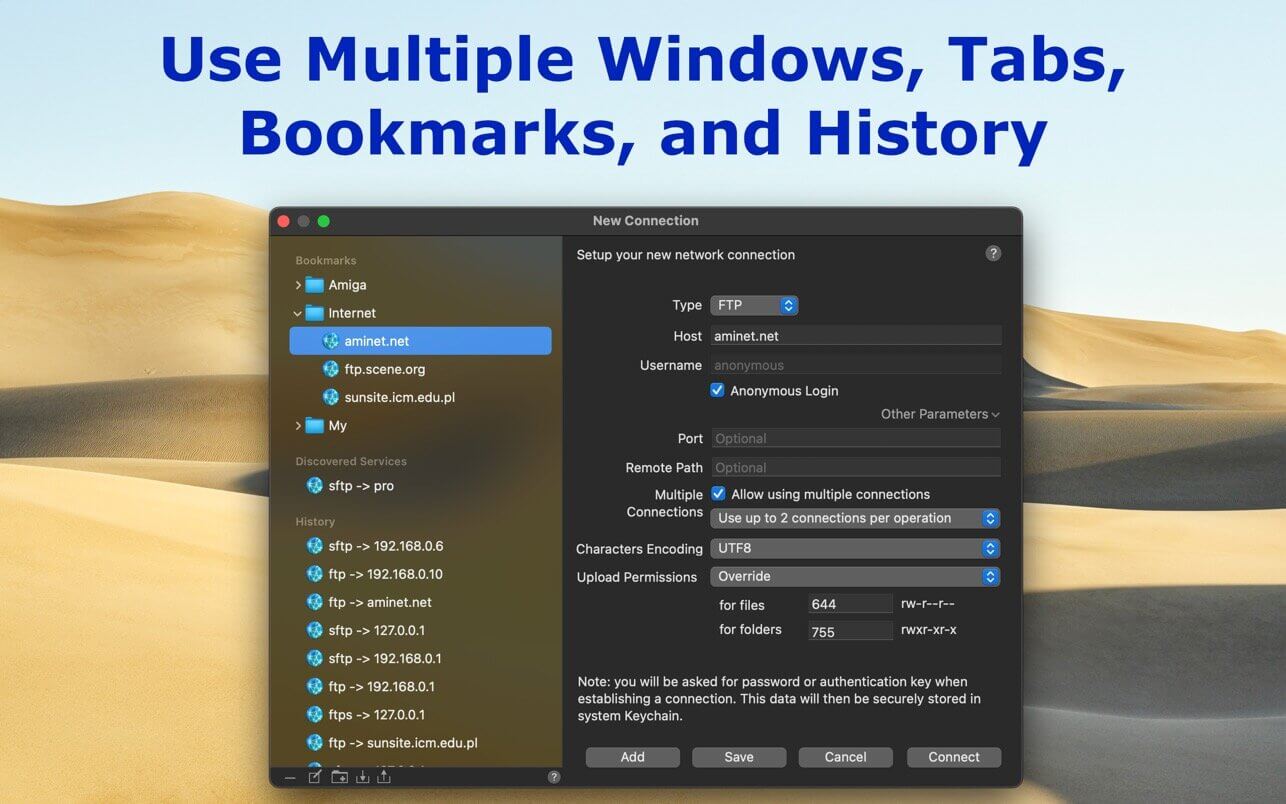 SFTP Commander is a file transfer application with a lightweight but very functional user interface inspired by web browsers. Therefore it has an address bar, ‘back’ and ‘forward’ buttons, and managing bookmarks and browsing history. All you need for using FTP/SFTP on macOS.