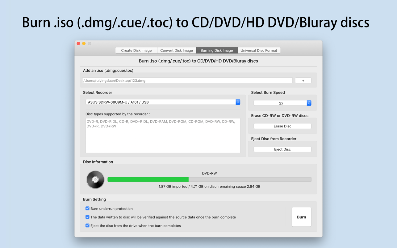 - [1] Burn .iso(.dmg/.cue/.doc) to CD/DVD/HD-DVD/Blu-ray discs;