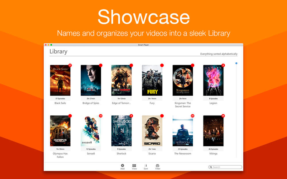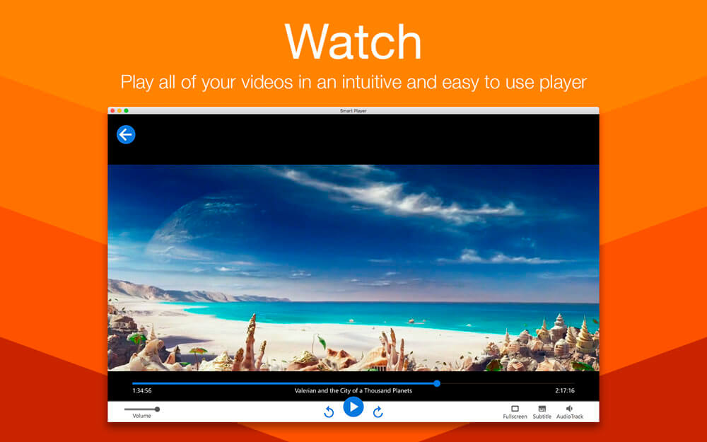 Smart Player makes watching videos on your Mac effortless! It plays al common file types (MOV, MP4, MKV, AVI plus manymore) with ease. As you add video files to your Mac, Smart Player automatically adds them to its library. The app recognizesmovies, TV shows and home videos, and groups them for you.
