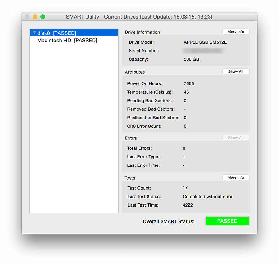 Displays important information in the main window, such as drive model, capacity, power on hours, temperature, bad sector counts, and error counts and types