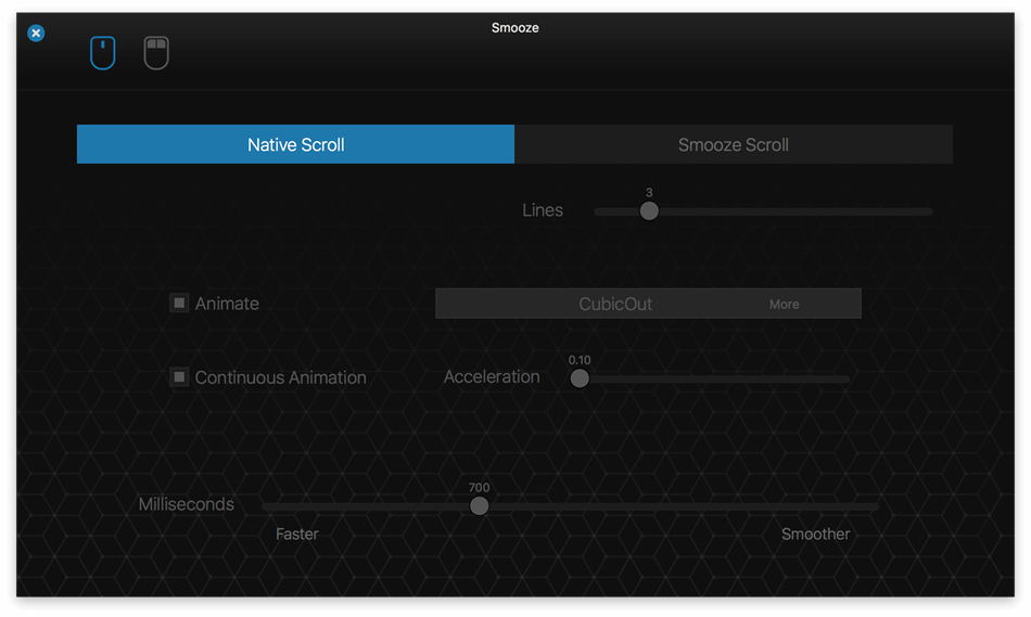 Even though macOS comes with a mouse preference pane, it is quite limited as it offers insufficient options for customizing the scroll feature, the mouse’s buttons, and absolutely no mouse gesture support. Smooze is an application designed to fill in the gap left by Apple in macOS’ mouse customization department. Once launched, Smooze will add a status bar item with a menu which enables you to set the app to start automatically on login, as well to disable its custom scroll engine and button actions, and access its options.