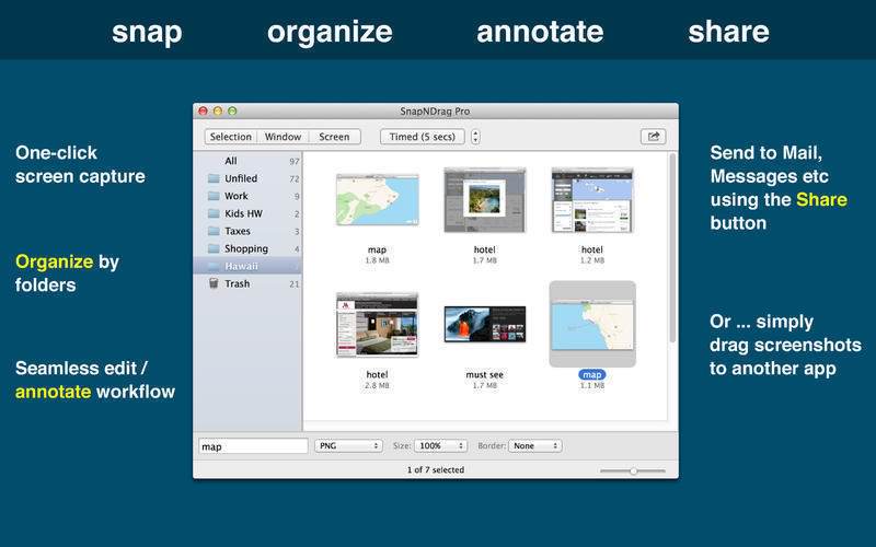 SnapNDrag started off as a simple app that lets you snap a screenshot with one click and then drag the result off to Mail, Finder, or any other app that accepts an image. It has since matured into a powerful screenshot tool that helps you annotate, organize, and share your screenshots.