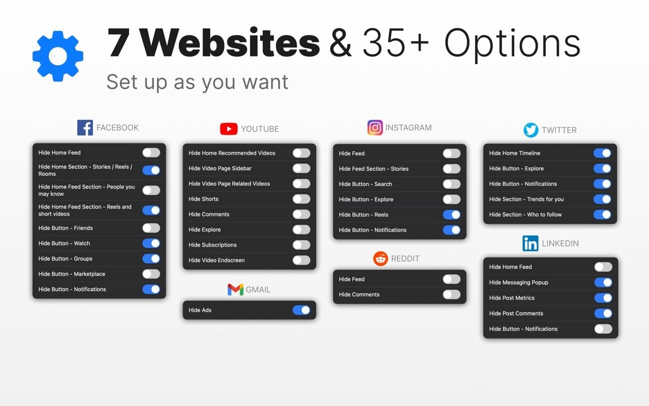 We have identified those parts in each of these websites that grab our attention and serve us unlimited content all day. This extension enables you to hide each of these parts selectively.