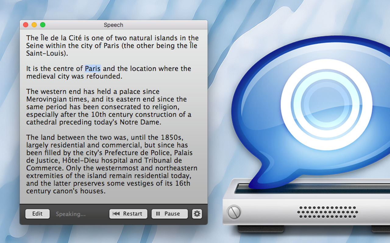 Speech combines all the features of the speech synthesizer of macOS into a single, easy-to-use interface. Many languages are available: choose among more than 40 voices and languages.