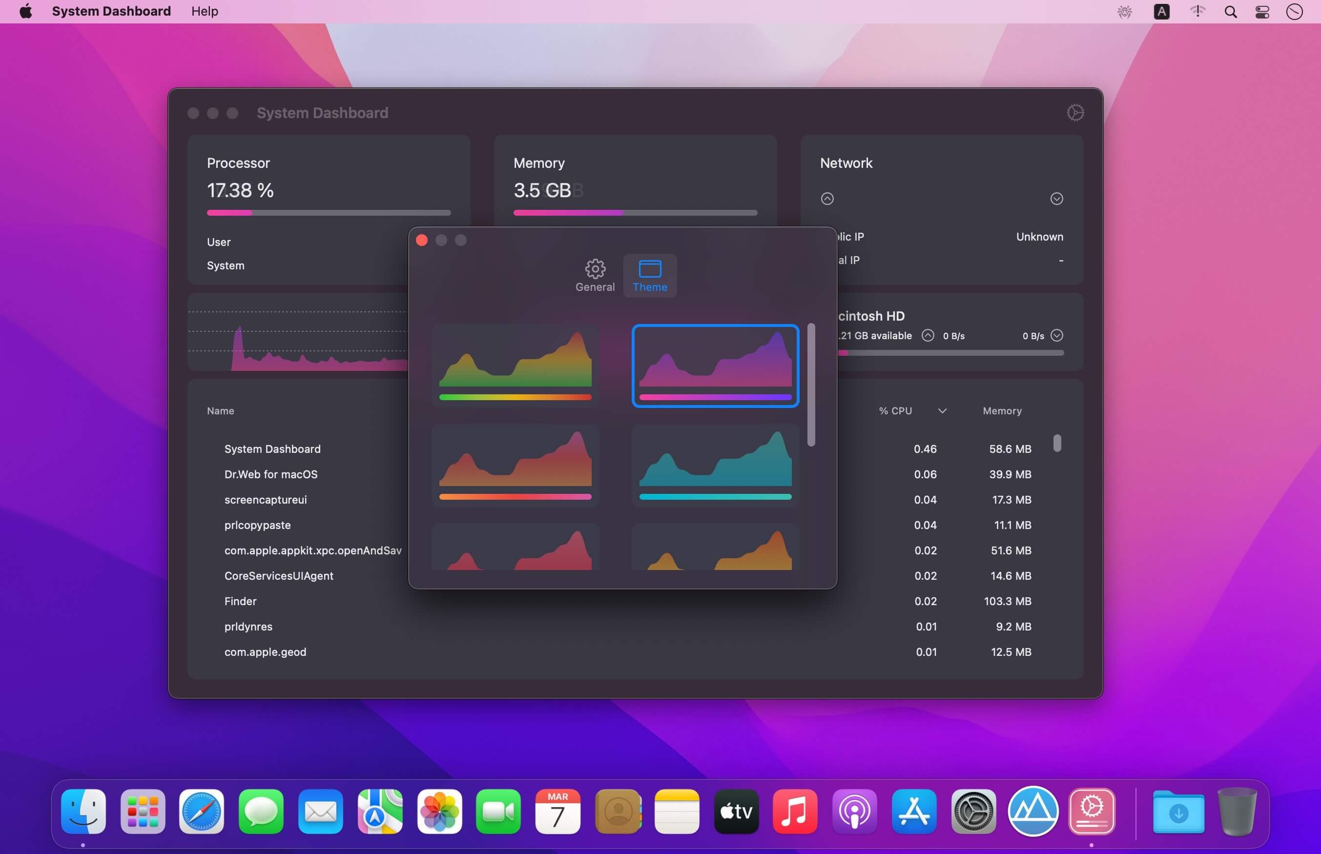 System Dashboard shows the processor, memory, network and disk usages in a small and lightweight window.