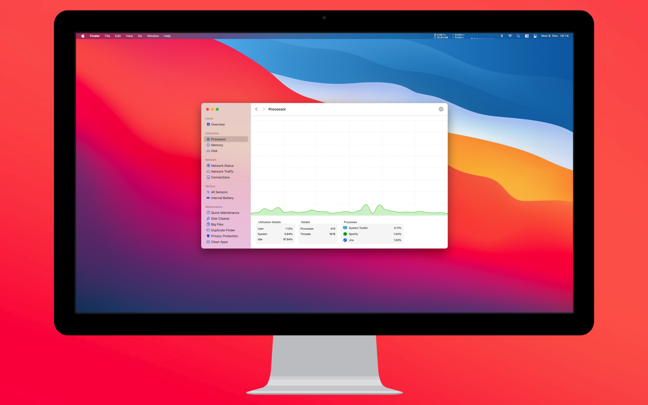 Keep track of all your system loads. This includes CPU load, memory usage, network speeds and -traffic and the open network connections. All information can be shown in both the menu bar extra and the overlay window. Use the Dashboard to take a look at the most important parameters.