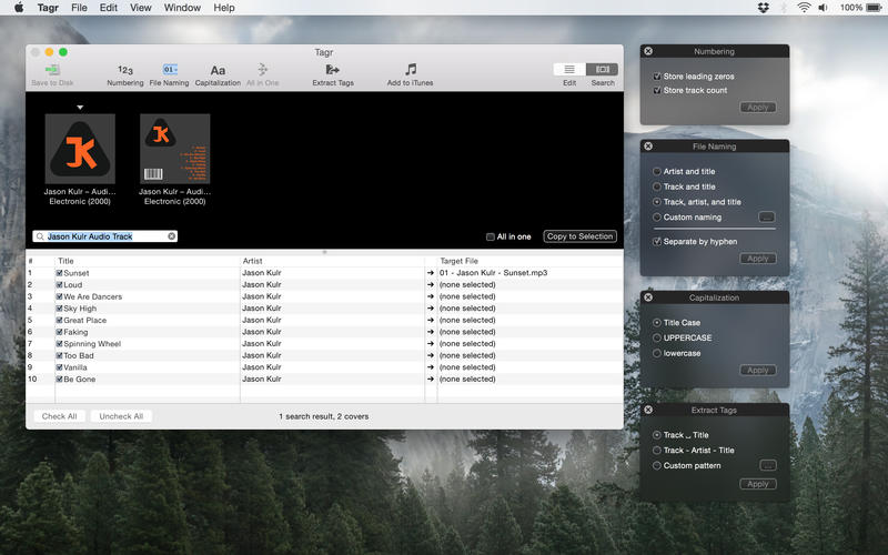 With Tagr you can easily edit information such as a song’s artist, title, or album cover. Tagr also allows you to control the way your files are named, numbered, and capitalized. There is no more need for having other tools dictate that for you!