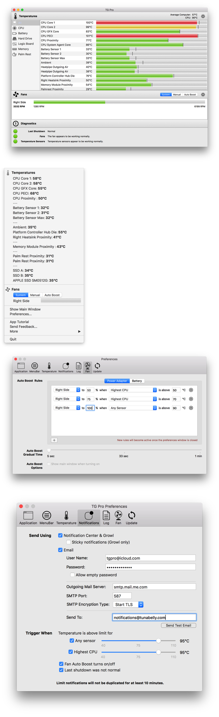 Take a look at what’s going on inside your Mac with TG Pro – no other app shows more temperature sensors or has as many options for notifications and fan speeds.Find out which components are getting hot (and potentially overheating), turn up the fan speeds to cool down your Mac, get notifications for temperature alerts along with many other fantastic features. Plus, see if any sensors or fans are defective with the built-in hardware diagnostics.