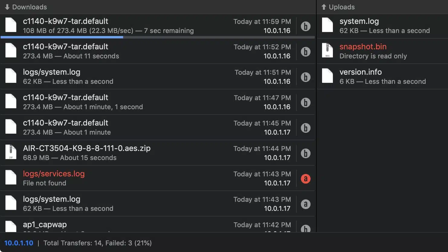Transfer is a reliable and fully RFC-compliant TFTP server application. The perfect alternative to the built-in TFTP server on your Mac. It’s got everything you expect: real-time updates of current transfers in progress, support for broadcast requests, transfer history and basic root directory access control and file management. A feature rich TFTP server with a simple and modern user interface.