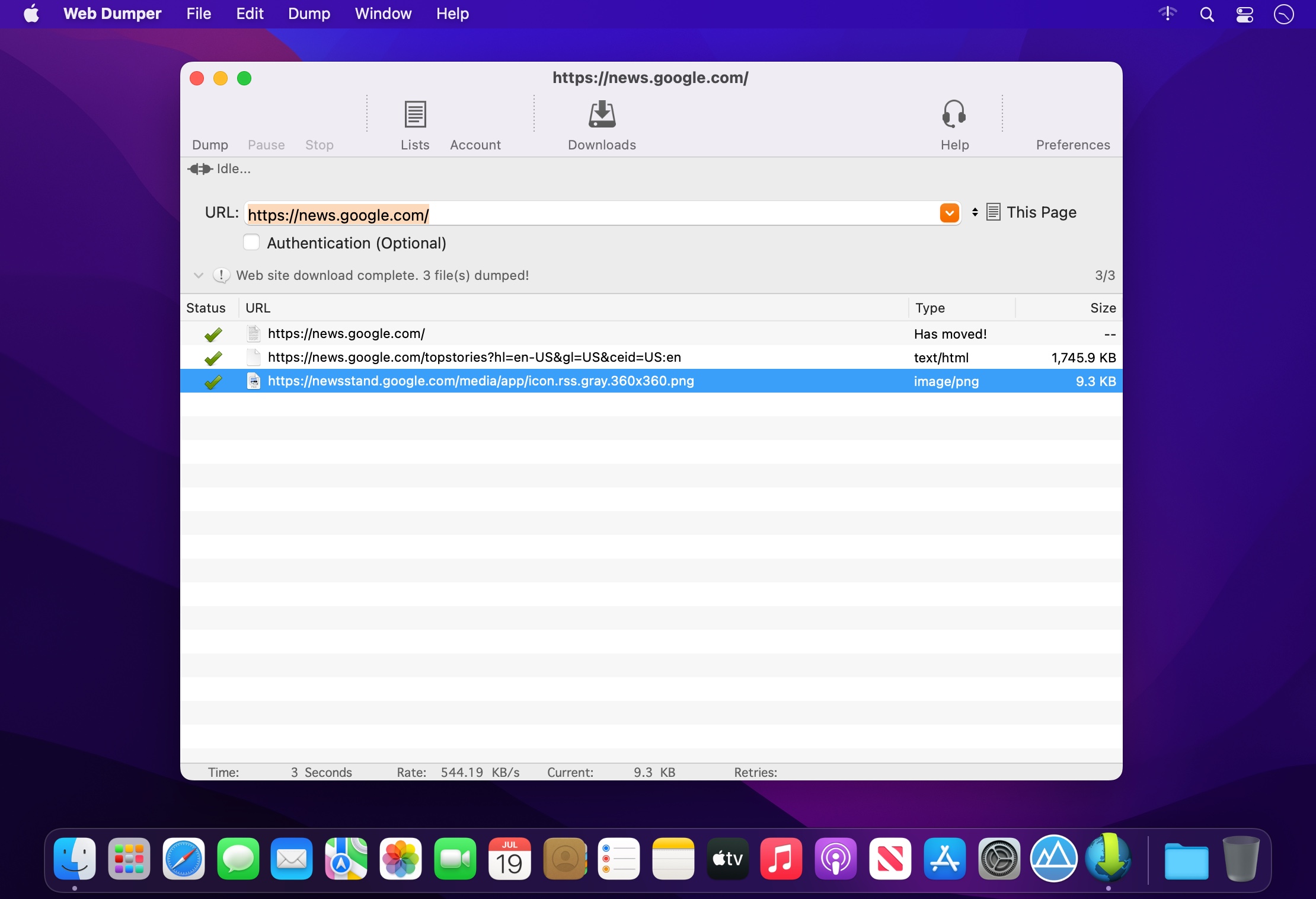 With Web Dumper you can download entire Websites off of the Internet, and save them on your hard drive for later offline browsing. Downloaded Web sites are saved on your hard drive with their directory structure intact. Web Dumper automatically downloads HTML documents along with their embedded pictures, sounds, movies and so on while it screens them to look for any enclosed links to other documents.