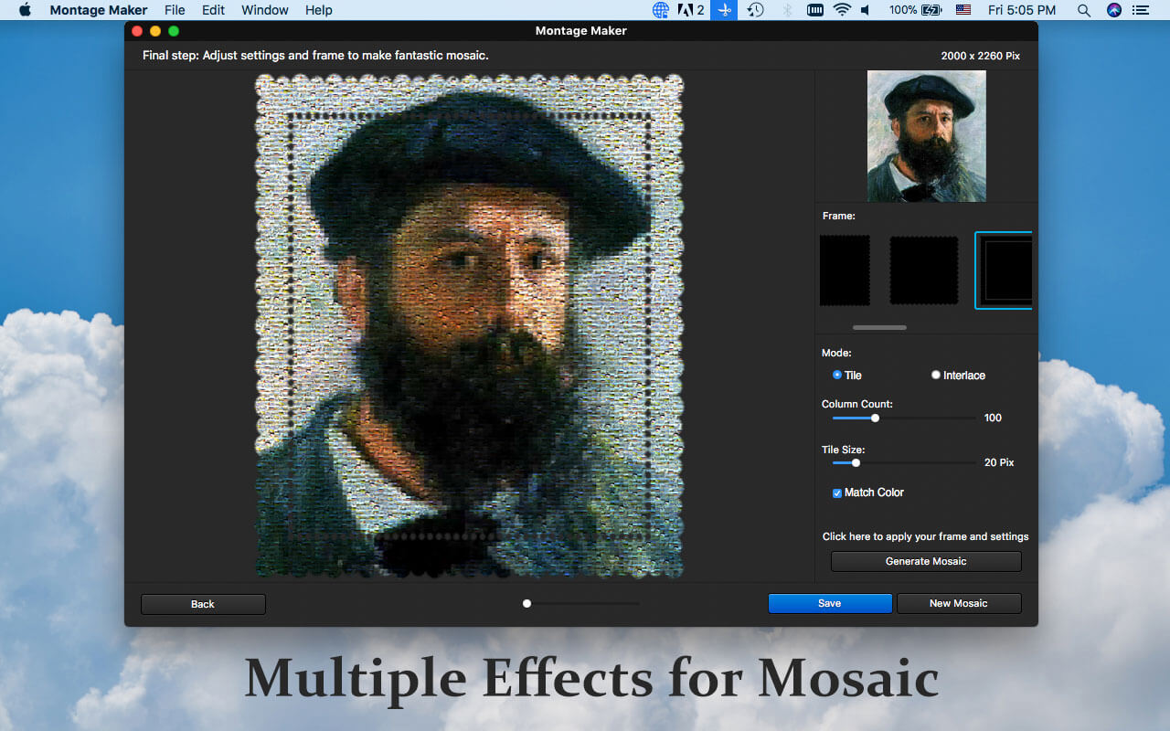WidsMob Montage turns everything into mosaic photographs. You can set both JPEG and PNG into mosaic, the program supports photo mosaic, tile mosaic, shape mosaic and other photo mosaic types. What is more, you can also design photo montage in shape according to any template.