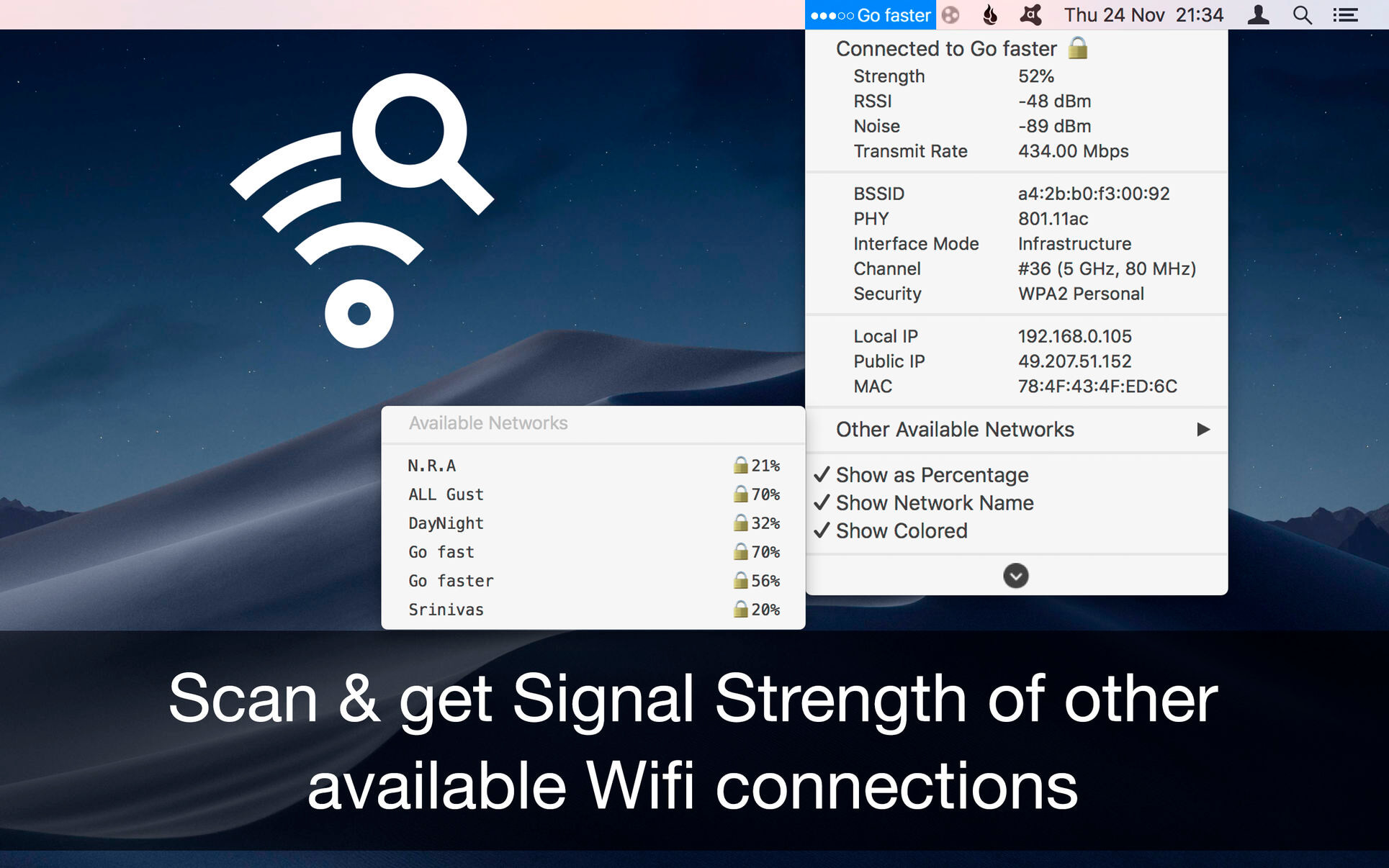 WiFi Signal is a system menu bar application that provides easy access to your Wi-Fi connection details (name, channel, transmit rate, signal strength, noise, etc.), monitors the signal quality of your wireless network, and can find and recommend alternative channels for your network thus avoiding signal overlapping and channel conflicts that can result in connectivity issues and performance degradation.